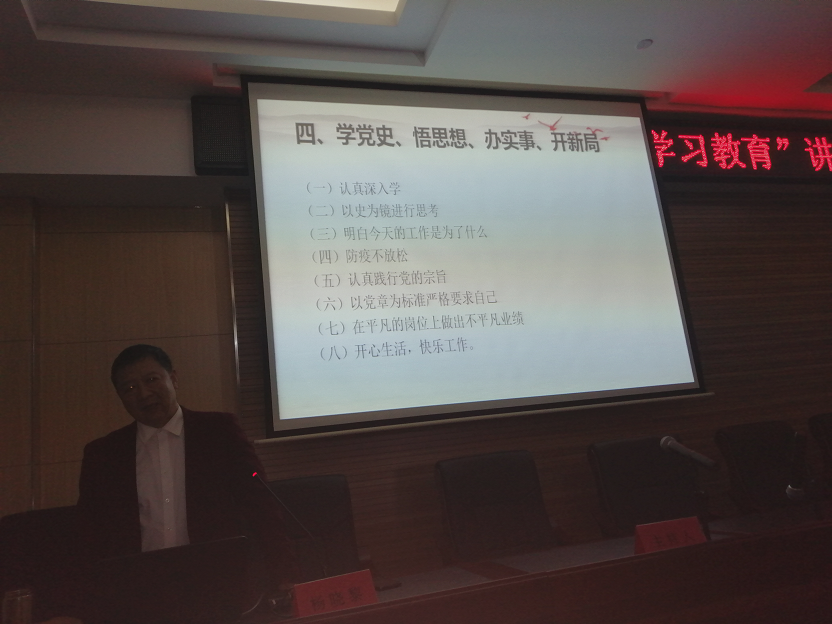 動員結(jié)束后,緊接著由市委黨校楊曉黎教授為我們作了精彩的“黨史學(xué)習(xí)教育”專題報告。楊教授為我們解讀了中國共產(chǎn)黨由誕生、發(fā)展、壯大到建立新中國,以及帶領(lǐng)全國人民建設(shè)小康社會艱難而輝煌的革命歷程。同時楊教授也結(jié)合自己對黨史的研究體會,以豐富的史實、鮮明的觀點、精辟的語言,向我們闡述了中國共產(chǎn)黨100年艱苦卓絕的風(fēng)雨歷程,總結(jié)出沒有共產(chǎn)黨就沒有新中國的偉大真理。報告深入淺出、內(nèi)容豐富,對我們加強(qiáng)黨的歷史和思想政治理論學(xué)習(xí),進(jìn)一步提高黨性修養(yǎng),具有很強(qiáng)的理論指導(dǎo)作用。報告很受教育,很受啟發(fā),收獲很大。會議最后,集團(tuán)總支副書記汪明星要求廣大黨員干部認(rèn)真學(xué)習(xí)領(lǐng)會,掌握實質(zhì),以飽滿的工作熱情和扎實的工作作風(fēng),認(rèn)真履行職責(zé),努力工作,為公司的發(fā)展壯大貢獻(xiàn)力量。