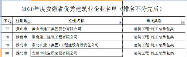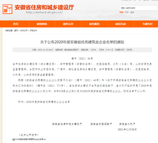 近日,安徽省住建廳傳來喜訊,2021年度安徽省優(yōu)秀建筑業(yè)企業(yè)評選結(jié)果已出爐,黃山市建工集團(tuán)榮獲2020年度安徽省優(yōu)秀建筑業(yè)企業(yè)---建筑工程施工總承包類優(yōu)秀建筑業(yè)企業(yè)。