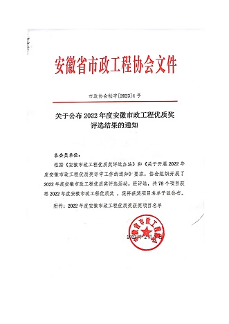 根據(jù)《安徽市政工程優(yōu)質(zhì)獎評選辦法》和《關(guān)于開展2022年度安徽市政工程優(yōu)質(zhì)獎評審工作的通知》要求,安徽省市政工程協(xié)會組織開展了2022年度安徽市政工程優(yōu)質(zhì)獎評選活動。黃山市建工集團股份有限公司承建的黟縣五里轉(zhuǎn)盤至開發(fā)區(qū)段道路及雨污管網(wǎng)升級改造項目榮獲2022年度安徽市政工程優(yōu)質(zhì)獎。