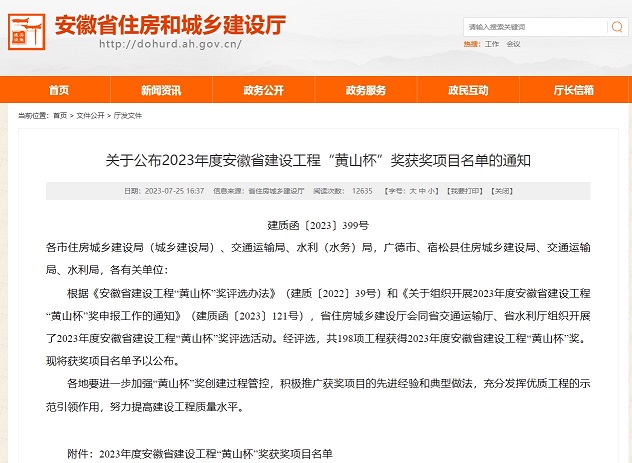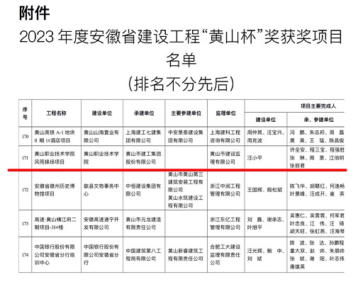 7月25日,省住建廳公布2023年度安徽省建設(shè)工程“黃山杯”獎(jiǎng)獲獎(jiǎng)項(xiàng)目名單,黃山建工承建的黃山職業(yè)技術(shù)學(xué)院風(fēng)雨操場(chǎng)項(xiàng)目工程位列榜單、喜獲殊榮。