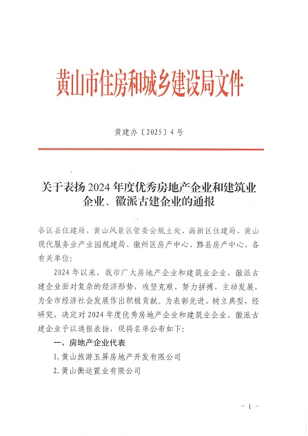 近日,黃山市住房和城鄉(xiāng)建設(shè)局發(fā)布了《關(guān)于表揚(yáng)2024年度優(yōu)秀房地產(chǎn)企業(yè)和建筑業(yè)企業(yè)、徽派古建企業(yè)的通報(bào)》,黃山建工集團(tuán)榮獲2024年度優(yōu)秀建筑業(yè)企業(yè)稱號。