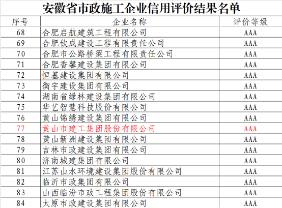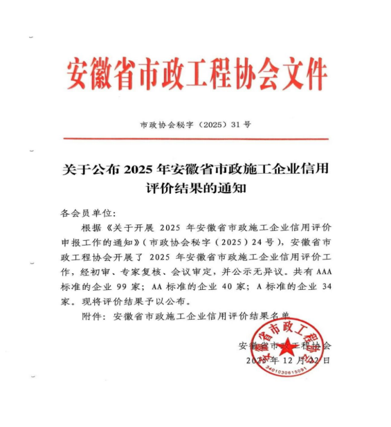 近日,安徽省市政工程協(xié)會正式發(fā)布《關(guān)于公布2025年安徽省市政施工企業(yè)信用評價結(jié)果的通知》。黃山市建工集團(tuán)憑借卓越的綜合實(shí)力、規(guī)范的市場行為、優(yōu)良的工程品質(zhì)及堅實(shí)的信用體系建設(shè),成功獲評最高信用等級——AAA級。標(biāo)志著集團(tuán)在誠信經(jīng)營、履約能力與社會責(zé)任履行方面獲得了行業(yè)主管部門與協(xié)會的高度認(rèn)可,是企業(yè)信用建設(shè)領(lǐng)域的又一重要里程碑。